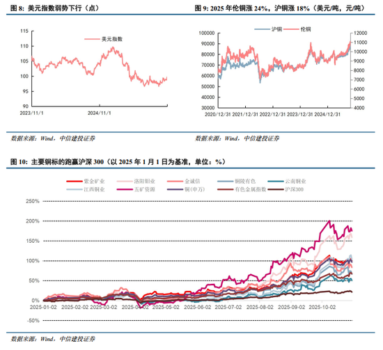 2025年全球铜价重心进一步上移,年末刷新历史价格记录,主导行情的主要事件及逻辑包括:美元弱势,以美元计价的资产,包括黄金、比特币等均创下价格历史高点,宏观配置资金流入买铜;供应干扰叙事贯穿全年,5月Kamoa-Kakula矿震、9月Grasberg遭遇泥石流、10月Teck下调QB2产量,不断恶化供应,强化多头信心;超强的AI投资奠定良好的远期消费预期,优化远期供需格局。截止2025年10月31日,LME三月期铝报收10891美元/吨,涨幅24.03%;沪铝主力报收86996元/吨,涨幅17.80%。权益市场,资源型铜矿企业股价表现全面跑赢有色指数及沪深300,其背后是产量、价格的双向提升推高EPS,同时,铜资源的稀缺性和AI经济中的不可或缺性越来越被市场认可,PE修复,共同造就了铜矿企业优异的股价表现。