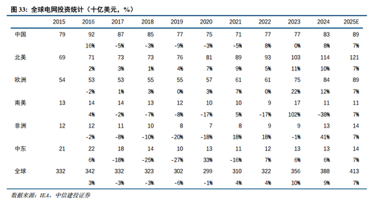 AI崛起,全球电力投资及电网扩容加码,成为助力铜消费增长的中坚力量。电力行业用铜主要分为两大部分,一大部分集中在建造发电厂时的电源系统,比如高压开关、母线等是用铜较高的设备,另一部分则是集中在输变电过程中的电网系统,比如变压器、高压电线电缆、低压电线电缆等用铜较为集中。随着终端电器自动化率的提升、AI算力崛起,加上电源侧由传统火电向风光核火并行转变,传统的电网容量已经不再能满足需求,新一轮的电网改革正在崛起。国家能源署IEA数据显示,全球的电网投资近三年来全面提速,复合增速在9%。为了应对AI算力需求的增长,预计中美电网投资未来五年以超10%的增速前进。