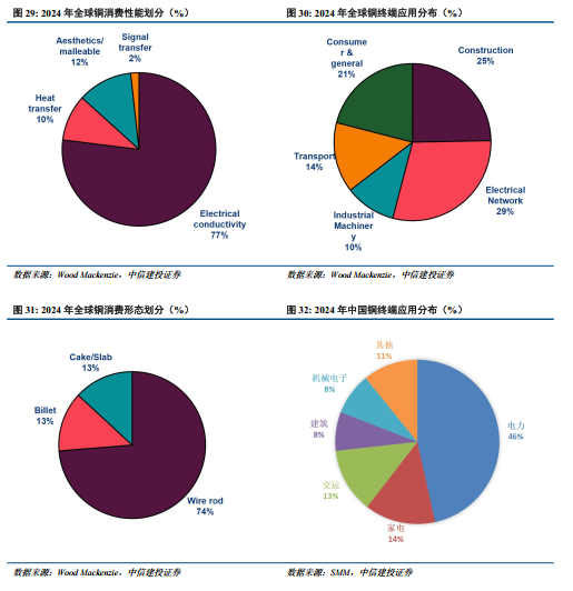 铜是具备性价比的导电材料。根据WoodMackenzie数据,2024年铜按照使用性能划分,导电性能77%,延展性能11%,热传导性能10%,信号传输性能2%;按终端应用场景划分,电网29%,建筑25%,消费品21%,交运14%,工业11%。优异且具性价比的导电性能,使其在当下新旧能源转化的时代获得强有力的消费驱动,具体到终端应用上,电网、地产、新能源车等领域均有提升空间。中国终端用铜分布电力46%、家电14%、交运13%、建筑8%、机械电子8%、其他11%。