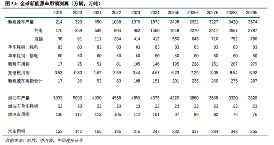 新能源三剑客:新能源车、风电、光电用铜占比提升,增速可观助力铜消费增长。新能源汽车的电池、电动机、高压高速连接器等对铜提出了新的需求,新能源汽车用铜量在传统汽车的基础上大幅增加。根据ICSG测算传统汽车单车、混合动力电动汽车、插电式混合动力汽车和纯电动车单车用铜量分别为23kg、40kg、60kg和83kg。根据新能源产量与单耗测算,2025年全球新能源车与配套充电桩用铜约201万吨,占全球用铜比重7.4%。鉴于海外汽车渗透率低,增长空间大,预计2025-2028年汽车领域用铜增长分别为45万吨、25万吨、17万吨、9万吨。