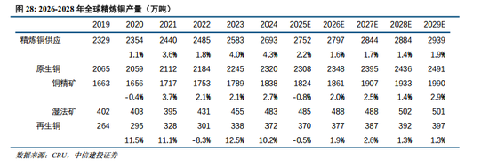 2025年精炼铜消耗矿库存,2026-2028年全球精炼铜产量增长1.6%、1.7%、1.4%